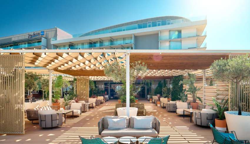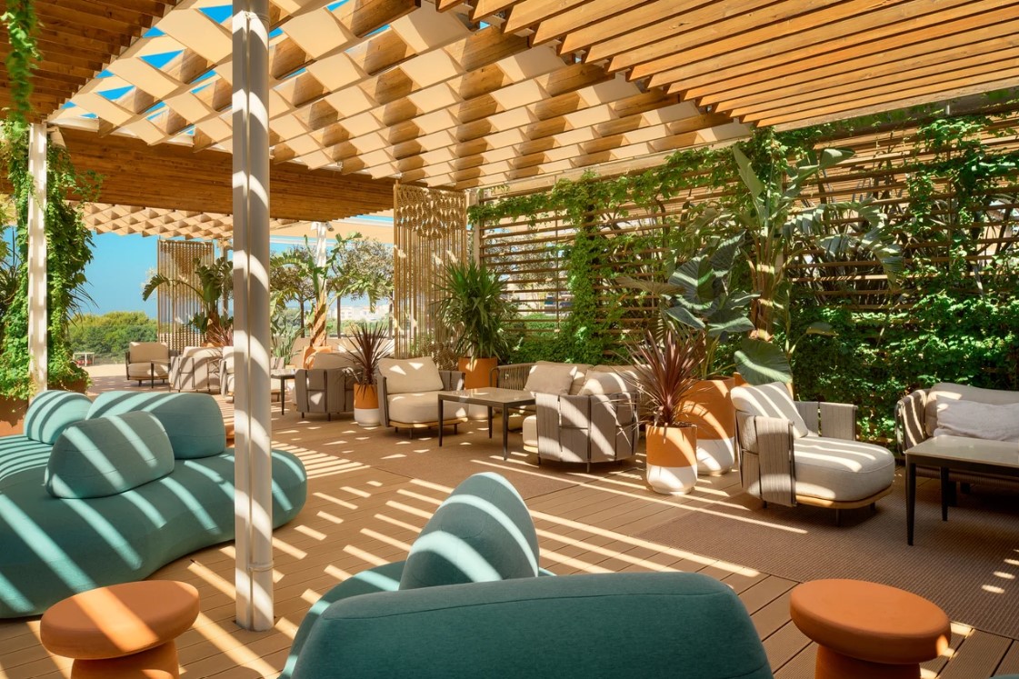 Die Identität der Bar, so heißt es weiter, wurde durch die gelungene Verbindung von mediterranem Flair und moderner, internationaler Architektursprache definiert. „Dies spiegelt sich in der Verwendung natürlicher Materialien wie Stein und Holz, warmen Farben, üppigem Grün sowie handgefertigten Details und künstlerischen Elementen wider. Auch die Raumgestaltung spielt eine wichtige Rolle: Klar voneinander abgegrenzte, aber dennoch miteinander verbundene Bereiche – Barista-Theke, Cocktailbar, Sitzecken und Terrasse – schaffen gemeinsam eine unverwechselbare Identität als stilvolles, aber ungezwungenes soziales Zentrum des Hotels“, ergänzt das Architekturbüro.